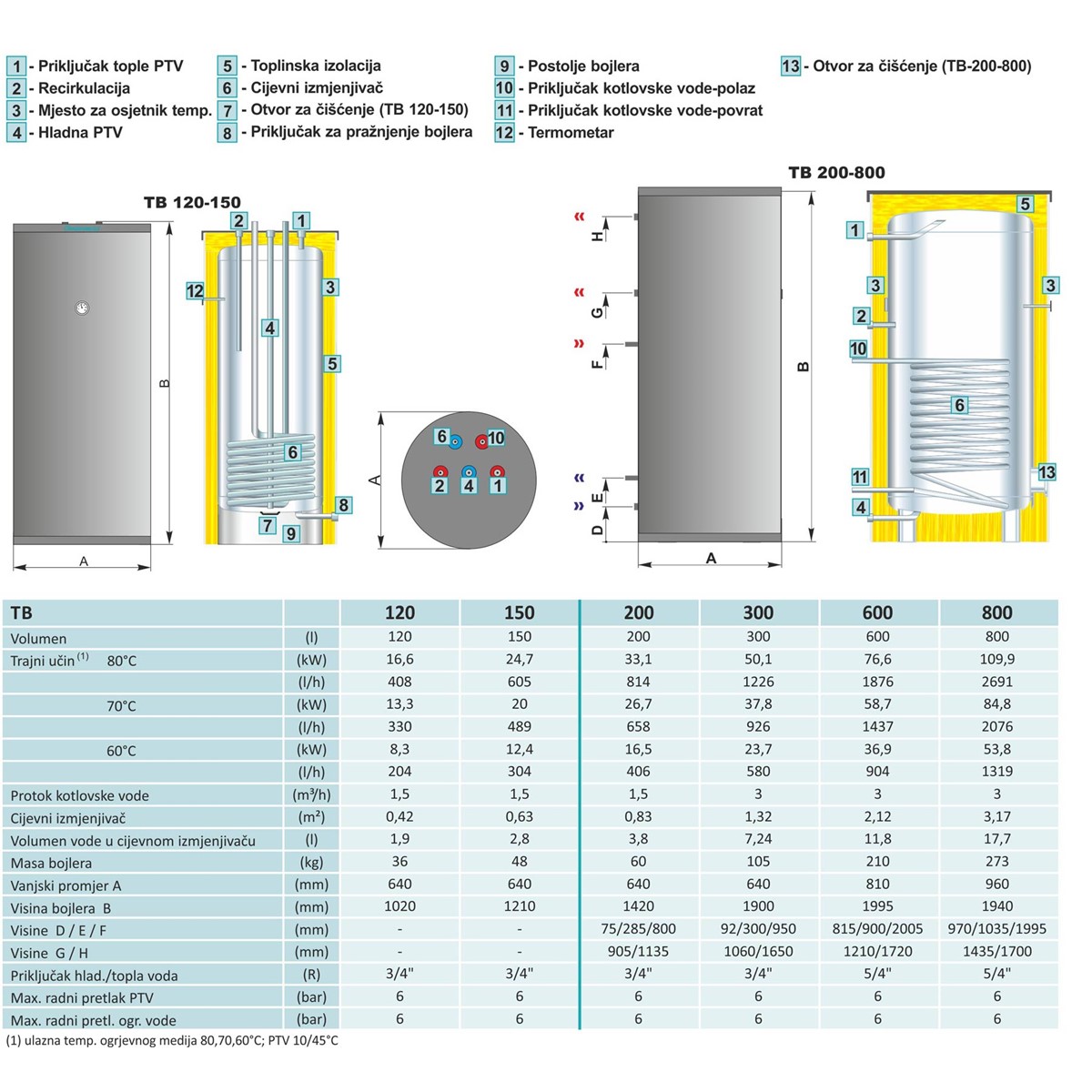 Toplovodni bojleri TB volumena 120, 150, 200, 300, 600 i 800 litara namijenjeni su zagrijavanju i akumulaciji potrošne tople vode spajanjem na krug kotla ili na neki drugi izvor topline unutar nekog tehnološkog procesa.