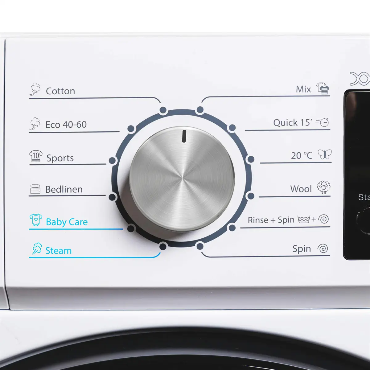 Funkcija sterilizacije bubnja pridonosi svježini i čistoči rublja. Kontrolna ploča perilice rublja s centralno smještenim okretnim gumbom za odabir programa i veliki zaslon pomažu da se u svega tri jednostavna koraka pokrene proces pranja.