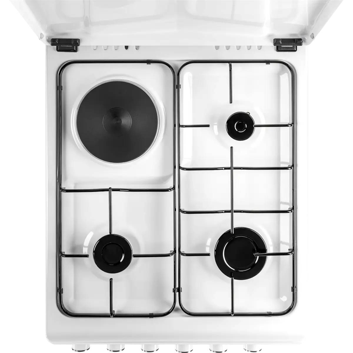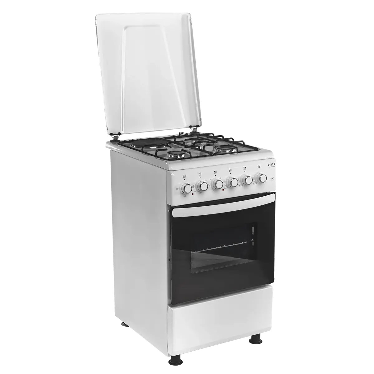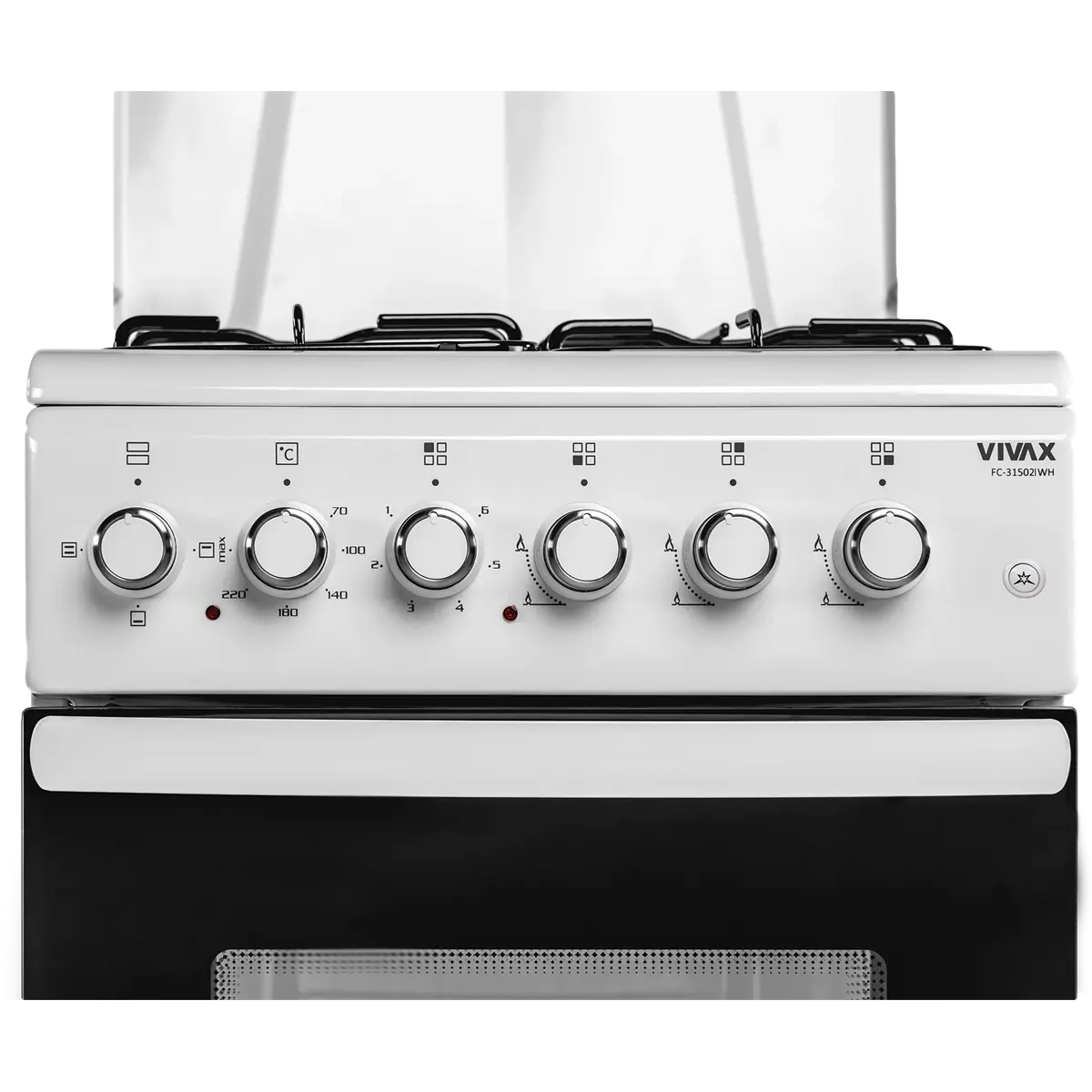 VIVAX samostojeći štednjak FC-31502I WH je plinsko-električni model štednjaka s jednom strujnom grijačom pločom i tri plinska plamenika.