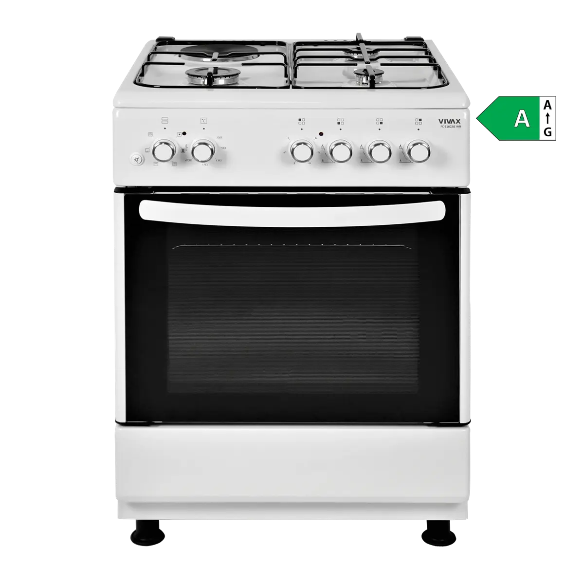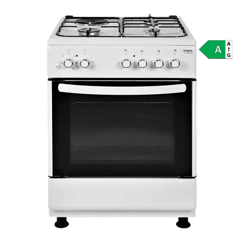 VIVAX samostojeći štednjak FC-31602IFS WH je plinsko-električni model štednjaka s jednom strujnom grijačom pločom i tri plinska plamenika.
