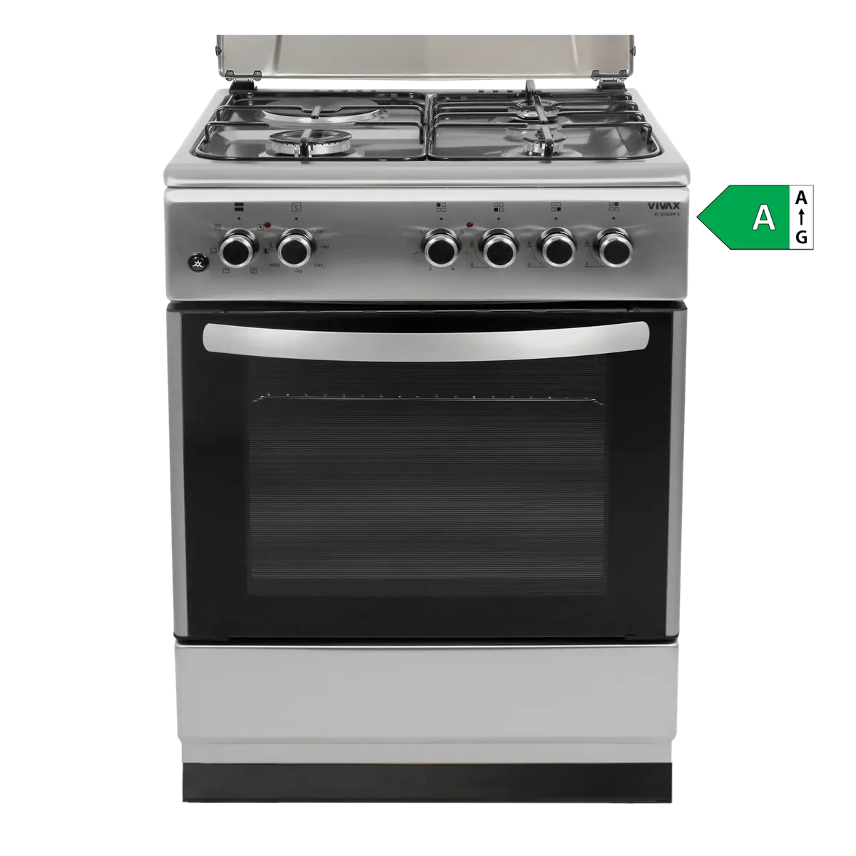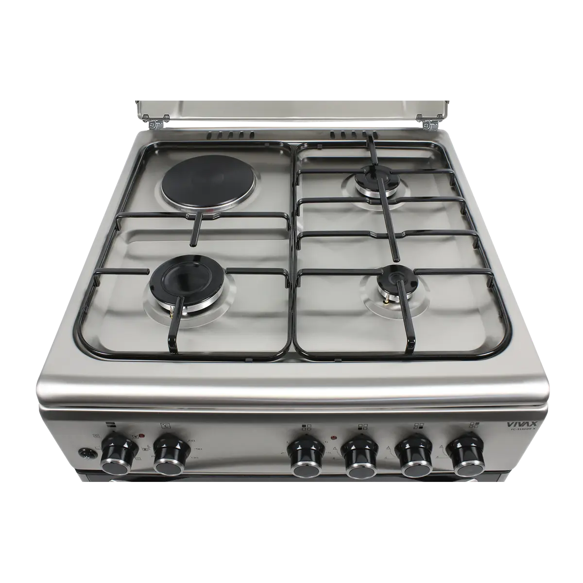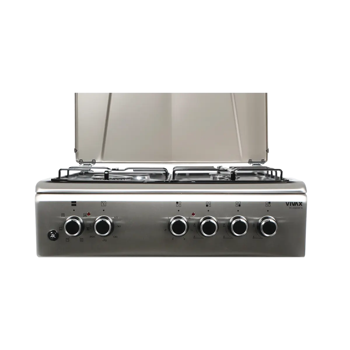 VIVAX samostojeći štednjak FC-31602IF X je plinsko-električni model štednjaka s jednom strujnom grijačom pločom i tri plinska plamenika. Plinski plamenici opremljeni su zaštitnim sklopom protiv neželjenog istjecanja plina, a paljenje plamenika vrši se pritiskom na tipku za davanje iskre.