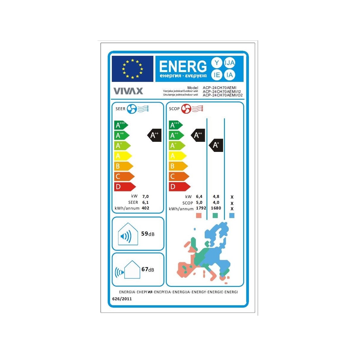 VIVAX M design klima ACP-24CH70AEMIs R32 ima nominalni kapacitet grijanja 7,33 kW i nominalni kapacitet hlađenja 7,03 kW. Posebna 3D inverter tehnologija pruža najbolje performanse, a istovremeno omogućuje znatnu uštedu energije. Bio filter je sastavljen od posebnog biološkog enzimskog i eko filtera koji ne propušta prašinu, neutralizira i uništava bakterije, gljivice i mikrobe, a filter prašine pomaže u zaustavljanju čestica prašine u uređaju čime se pospješuje kvaliteta zraka u prostoru. Unutarnja jedinica ima funkciju samočišćenja, nastavlja s radom kako bi osušila i očistila preostali kondenzat.